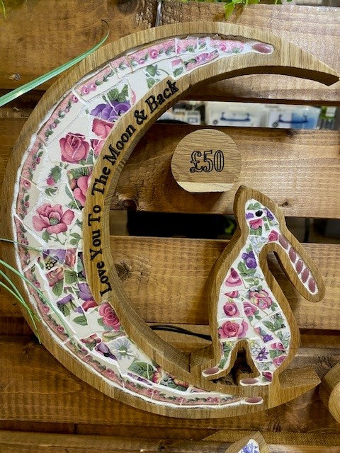 This beautiful moon and hare is made of oak, recycled china and engraved with the saying “Love you to the moon and back”.