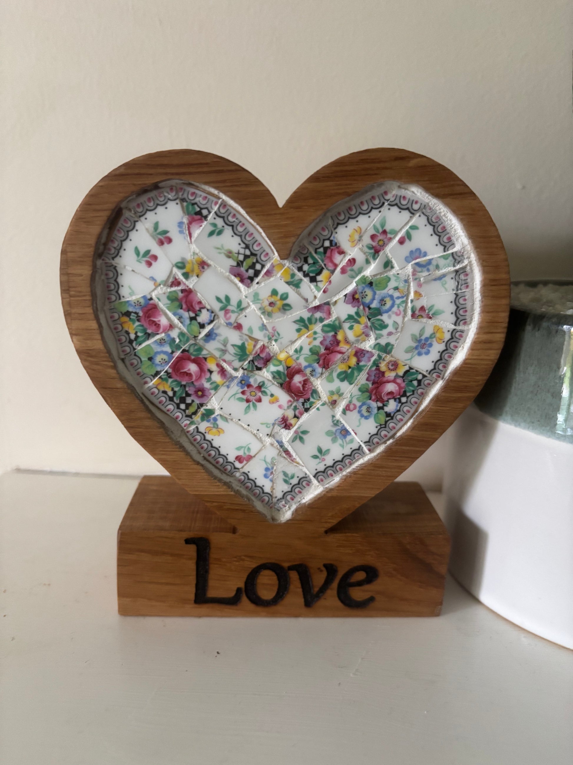 Mumma's Mosaics handmade oak hearts are created using recycled worktop and filled with recycled beautiful china.
