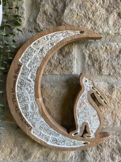 This beautiful moon and hare is made of oak, recycled gold and white china and engraved with the saying “Love you to the moon and back”.