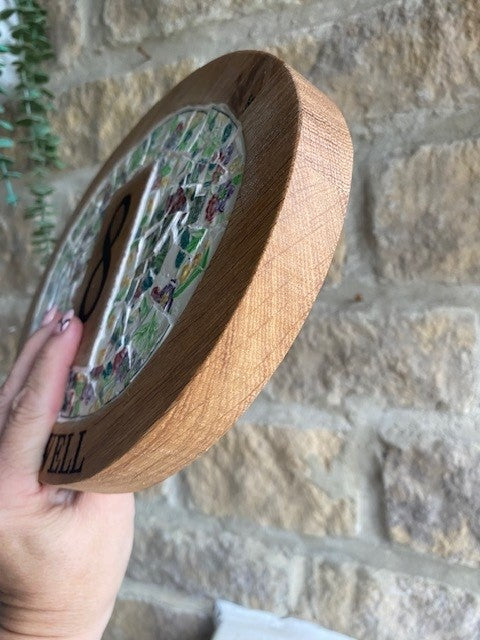 Give you home a fresh new look with something handmade and personal. This plaque is crafted from oak and can be personalised with recycled china plus any name or number of your choice....or even both!